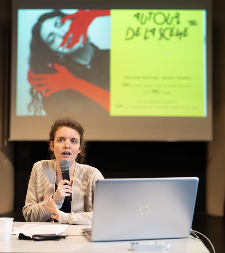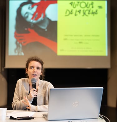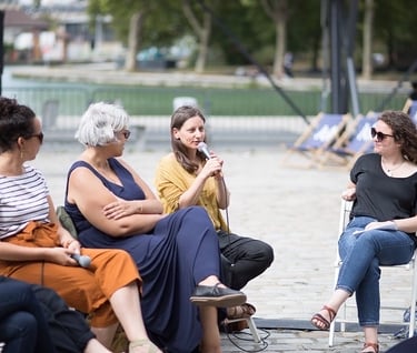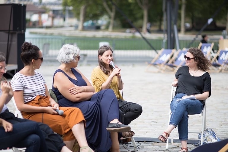 Animation de la table ronde "Les femmes dans le monde du jazz : à la recherche d'une représentation paritaire" au festival Constellations, Paris, 2022. Avec, de droite à gauche : Alexandra Grimal (saxophoniste), Émilie Delorme (CNSM), Margaux Hardoin (ex-Grands Formats), Tatiana Paris (guitariste), Nadia Ratsimandresy (Futurs Composés), Hannah Tolf (chanteuse) et Émilie Lesbros (chanteuse).