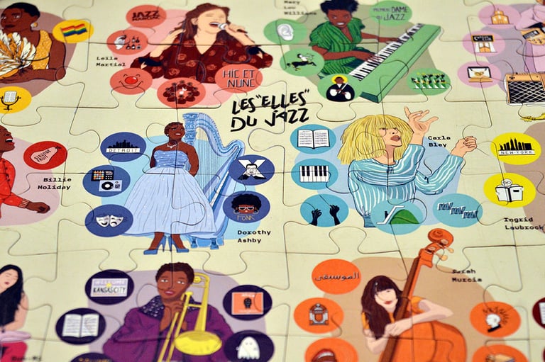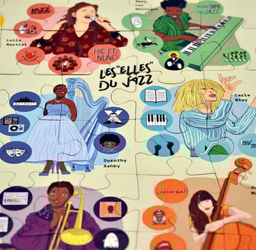 Prenant la forme d’un puzzle interactif, ce projet met en lumière 12 figures féminines du jazz issues de multiples époques, styles et nationalités : Bessie Smith, Billie Holiday, Sister Rosetta Tharpe, Mary Lou Williams, Melba Liston, Dorothy Ashby, Carla Bley, Ingrid Laubrock, Sarah Murcia, Airelle Besson, Leïla Martial, Sun-Mi Hong.