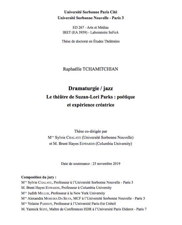 Cette thèse en Études Théâtrales vise à théoriser la tension « dramaturgie / jazz » à travers l’œuvre de l’autrice dramatique africaine américaine Suzan-Lori Parks. Née en 1963, Suzan-Lori Parks est aussi célèbre aux États-Unis qu’elle est inconnue en France. Traversé par la mémoire de l’esclavage et de la traite négrière, son théâtre dé(re)configure l’Histoire pour inverser le point de vue dominant, fabriquer un nouveau récit et apporter réparation aux vivants et aux morts. Aborder son écriture au prisme du jazz, c’est inclure dans l’espace de la réflexion la « double conscience » constitutive de sa poétique, et les enjeux anthropologiques, historiques et politiques qui y sont associés.